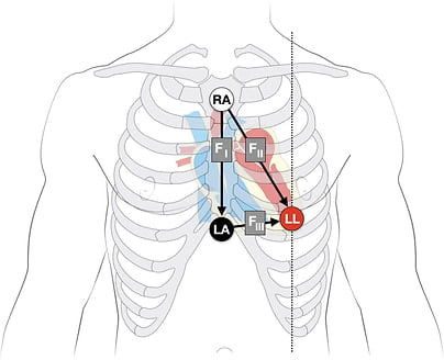 Fontaine bipolar precordial leads (F-ECG) are used to increase the sensitivity of epsilon wave detection. Leads are placed as shown: