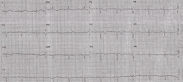 This ECG belongs to a 19-year-old male who presented to the Emergency Department (ED) with recurrent episodes of palpitations. Notably, he reported no chest pain or breathlessness at any time during the episodes, and there were no previous ECGs available for comparison. The patient was completely asymptomatic in between the episodes, and this ECG was taken while he was asymptomatic.